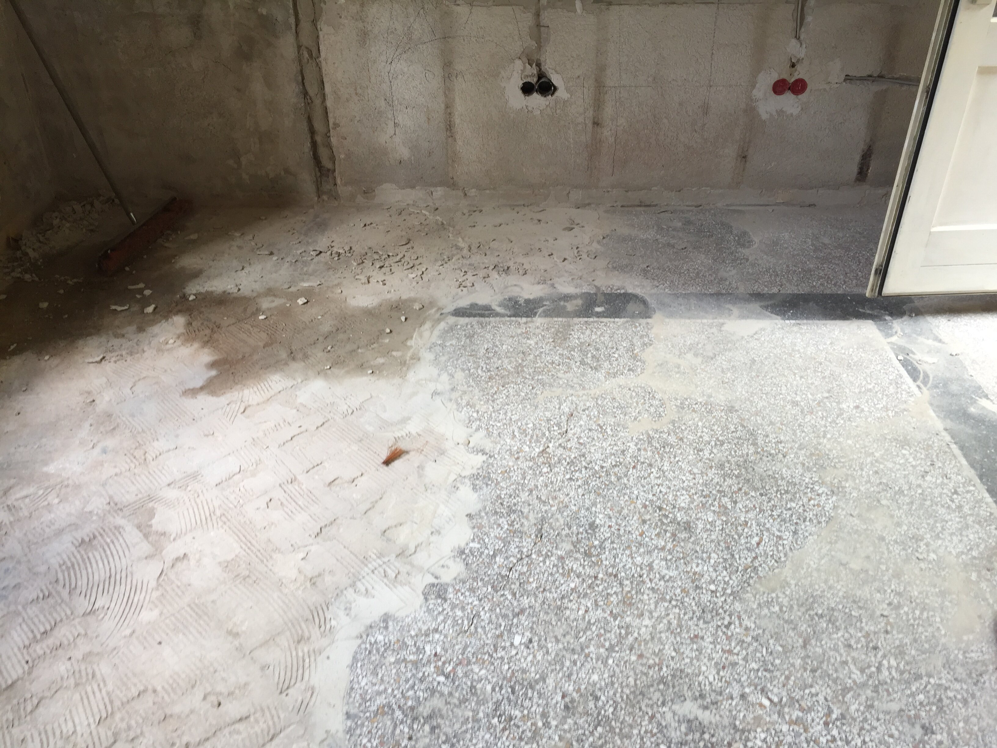 - Vor der Reparatur wird der Boden gründlich gereinigt, um Schmutz, Staub und alte Pflegemittel zu entfernen.